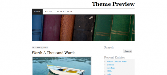 This one is a part of WordPress’s own collection. With its stark white background and its banner of thick old books, this theme looks wonderfully learned and esoteric. If you are writing book reviews, or if your blog is about the love of reading, or if you just want to add an old world feel to your blog, this will be a very appropriate theme for you to choose. The simple background ensures that whatever photograph or font color you use will look nice.